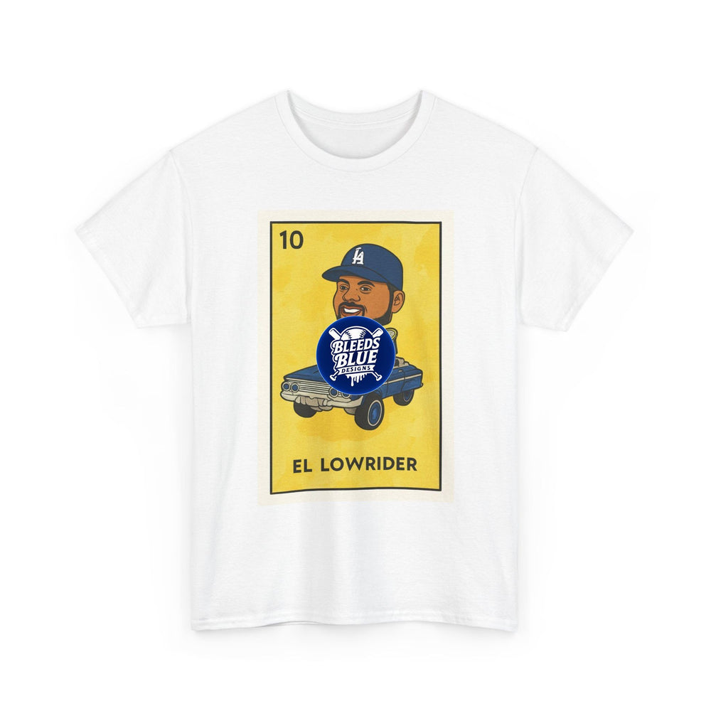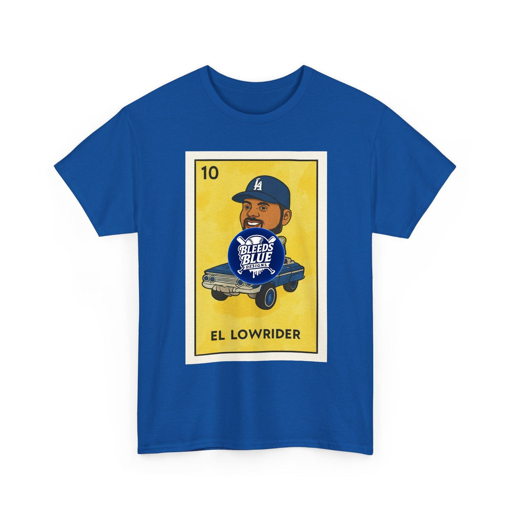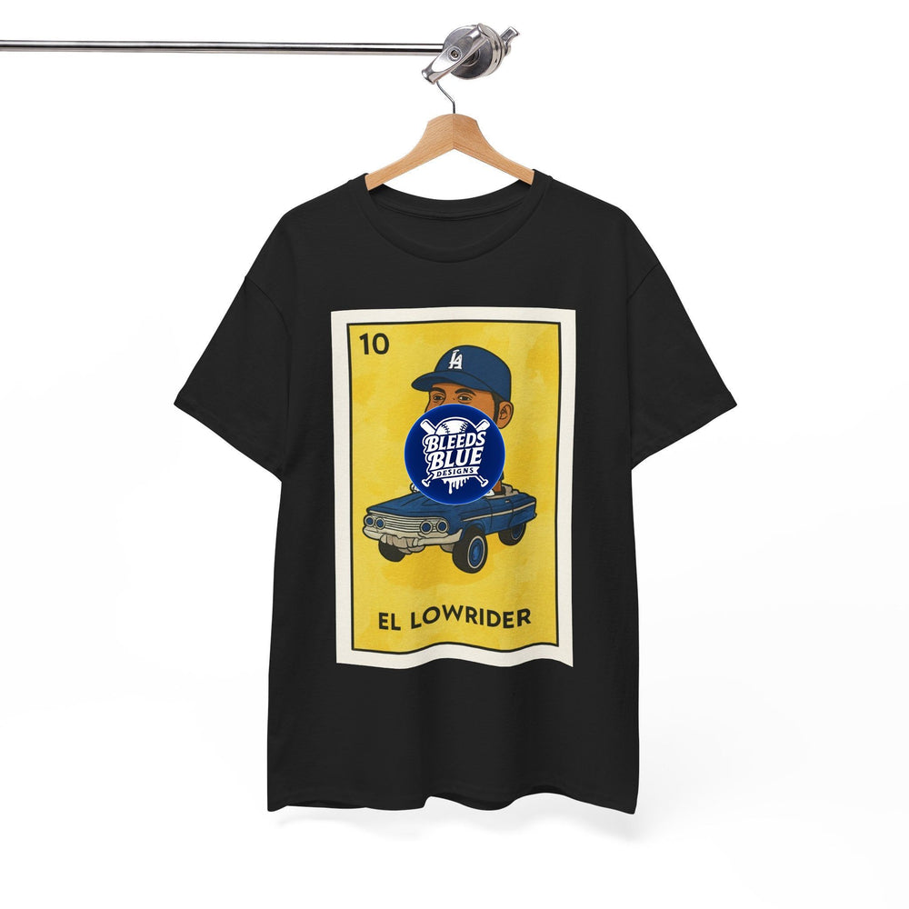 This classic cotton tee wears like a neighborhood story. A warm, sun-faded yellow print frames a playful lowrider card illustration — a smiling driver in a Dodgers cap cruising in a dropped classic — that reads “EL LOWRIDER.” The shirt’s relaxed cut and crew neckline make it feel lived-in from the first wear. Soft, durable cotton holds color and shape through repeat washes while the tear-away label keeps the neck itch-free. It’s a casual piece that slips into car meets, afternoon hangouts, and laid-back weekend runs, carrying a quiet pride and a wink of cultural nostalgia.